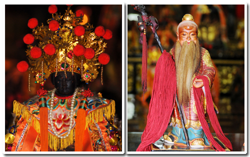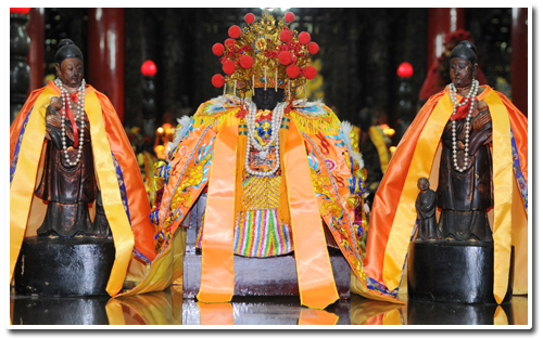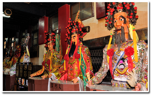 一樓供奉十殿閻王、酆都大帝、什家將、註生娘娘、月下老人、賞善司、罰惡司、黑白無常、文武判官、查察司、牛頭、馬面二將軍、幽冥地府眾鬼役……等眾神祇。殿前所掛大算盤即閻王司審喻具,有醒民誨眾作用。十殿閰王的神像是原廟尊座,非常寶貴。