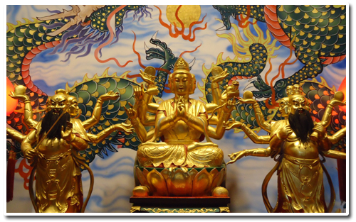 佛界按時間先後排列「三世佛」,按空間劃分亦有「三世佛」,而這兩種三世佛皆以 釋迦牟尼佛為中心。 釋迦牟尼佛的左脅侍為 文殊菩薩,文殊代表「大智」,其坐騎青獅,象徵智慧威猛,能降伏一切邪魔。右脅侍 普賢菩薩,普賢代表「大行」,坐騎大象,象徵威靈。 釋迦牟尼佛不停地到處傳道佈教,直到八十歲高齡,安祥地逝世。
