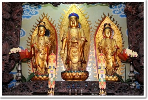 依佛教的說法,以時間來區分的三世佛是過去佛— 燃燈佛、現世佛— 釋迦牟尼佛,以及未來佛— 彌勒佛。而以空間劃分的三世佛是婆娑世界教主- 釋迦牟尼佛、東方教主- 藥師佛,以及西方極樂世界教主— 阿彌陀佛。祂和祂的代表慈悲的左脅侍 觀世音菩薩以及代表智慧的右脅侍 大勢至菩薩,被尊稱為西方三大聖人,又稱「阿彌陀三尊」。