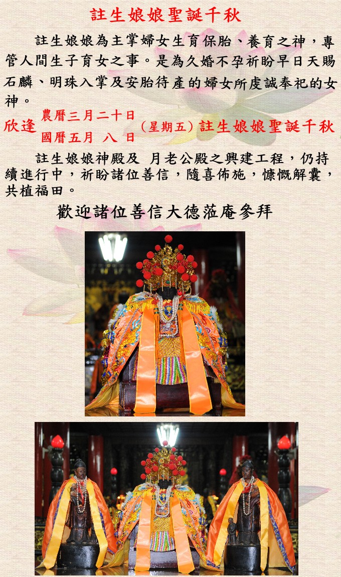 欣逢 農曆三月二十日(星期五) 註生娘娘聖誕,歡迎諸位善信大德蒞庵參拜,祈求閤家平安。