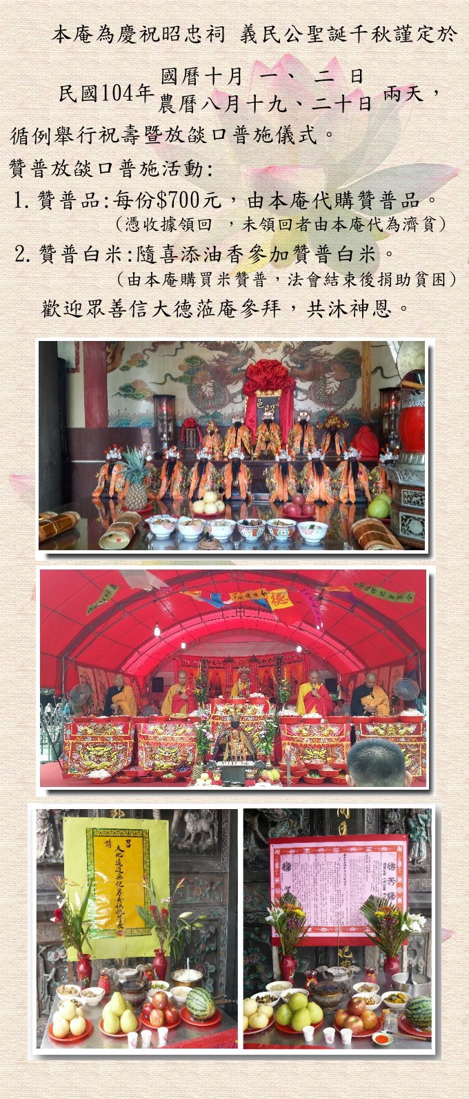本庵為慶祝 昭忠祠 義民公聖誕千秋謹定於農曆8月19、20日兩天,舉行祝壽暨放燄口普施法會。