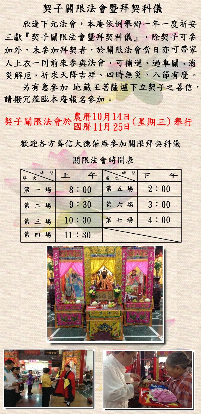 欣逢 下元法會,本庵將於農曆10/14(國曆11/25)舉辦【契子關限法會】祈求消災、補運、過車關。