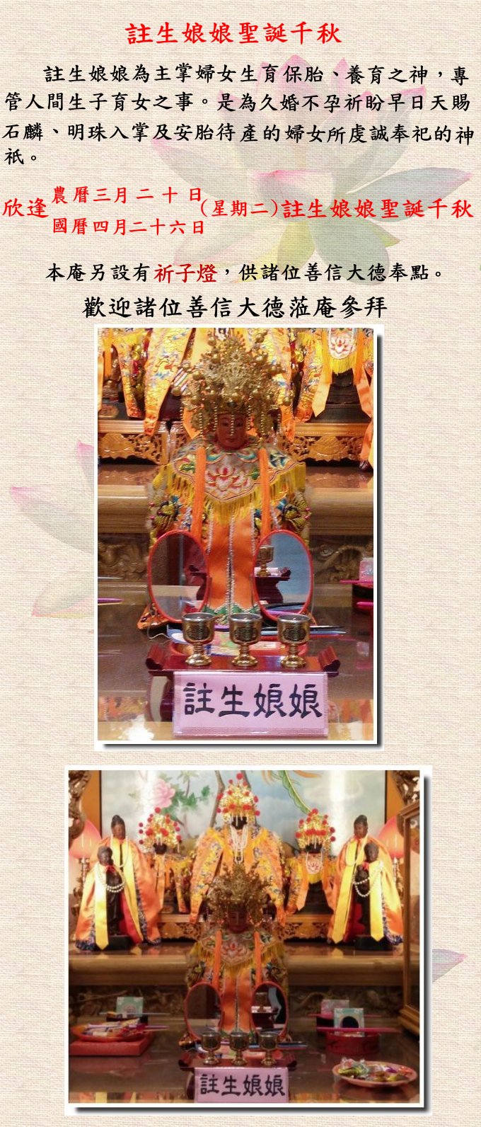 欣逢 農曆三月二十日(星期二) 註生娘娘聖誕,歡迎諸位善信大德蒞庵參拜,祈求閤家平安。