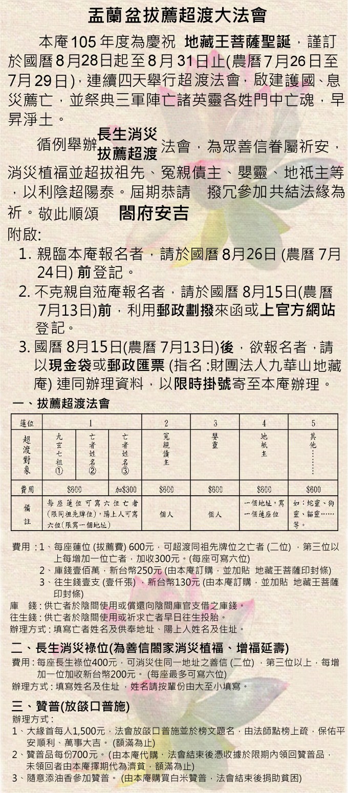 本庵105年度【盂蘭盆拔薦超渡、長生消災法會】訂於農曆7月26~29日連續四天舉行,已圓滿結束。