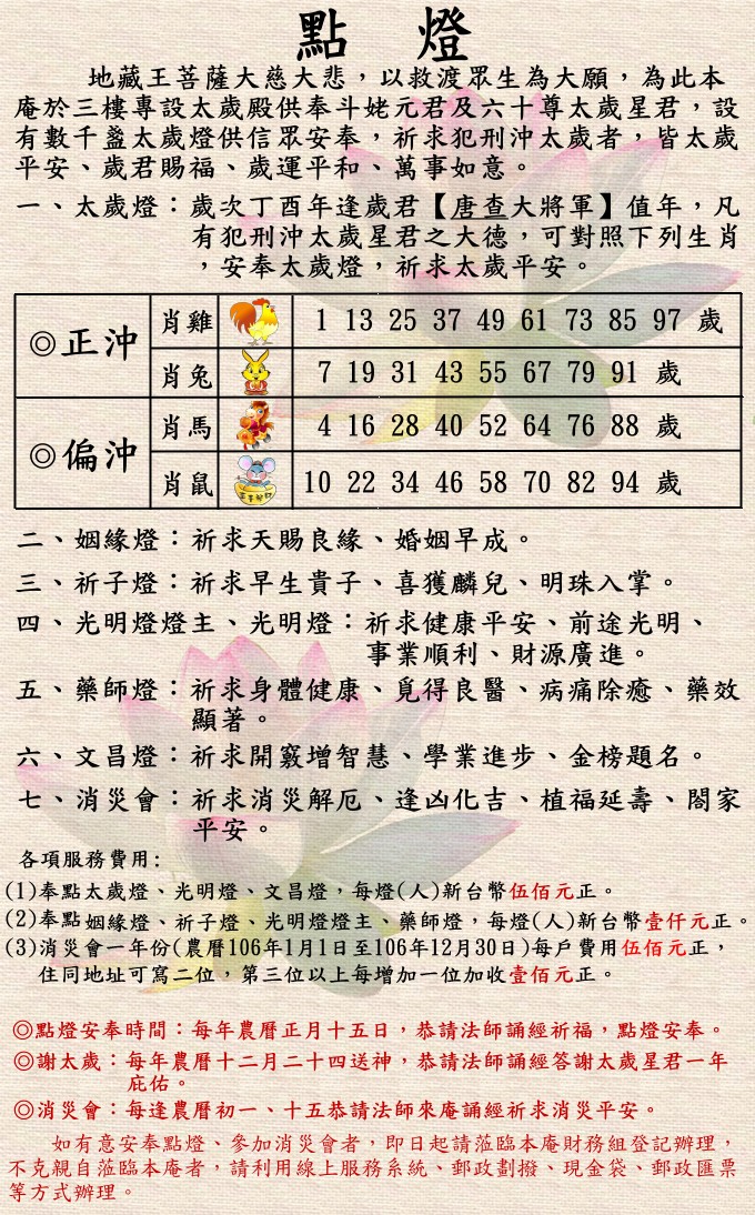 民國106年【歲次丁酉年肖雞】奉點太歲、祈子、姻緣、光明燈(主)、藥師、文昌燈及消災會持續受理中