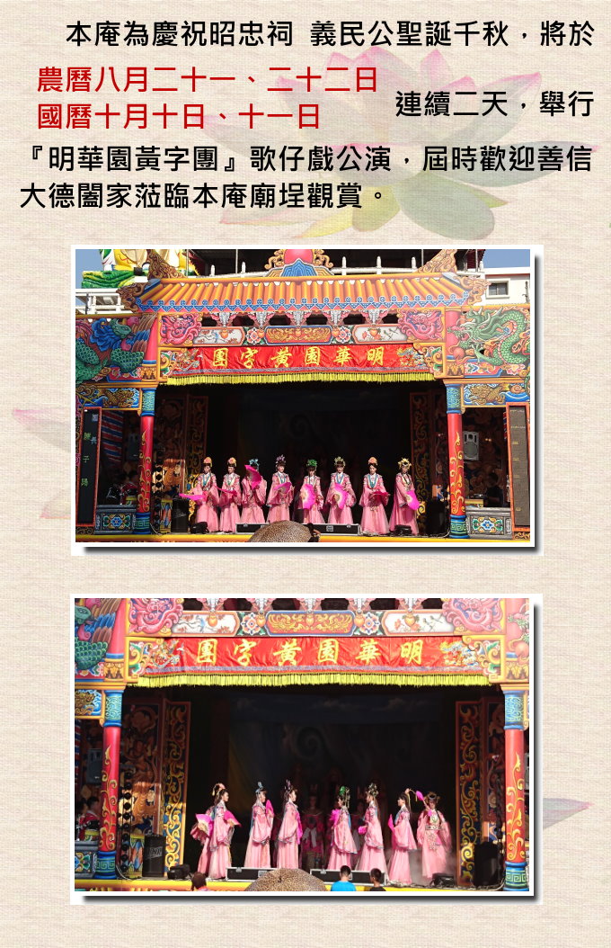 本庵為慶祝 昭忠祠 義民公聖誕千秋舉辦『明華園歌仔戲公演』自農曆8/21至8/22兩天歡迎蒞臨欣賞。