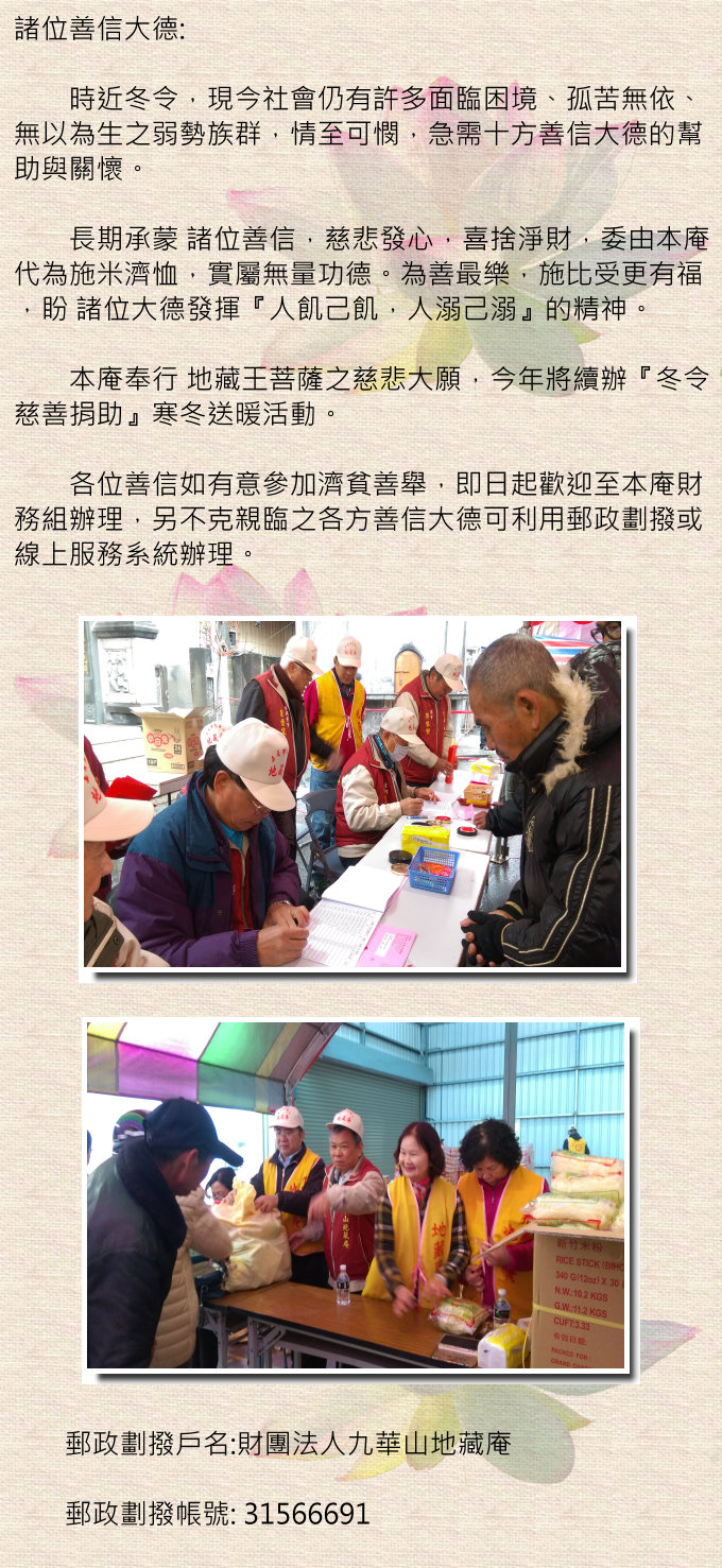 本庵今年續辦【冬令救濟慈善捐款】活動,急須各方善信慈悲發心,喜捨佈施,共襄盛舉。