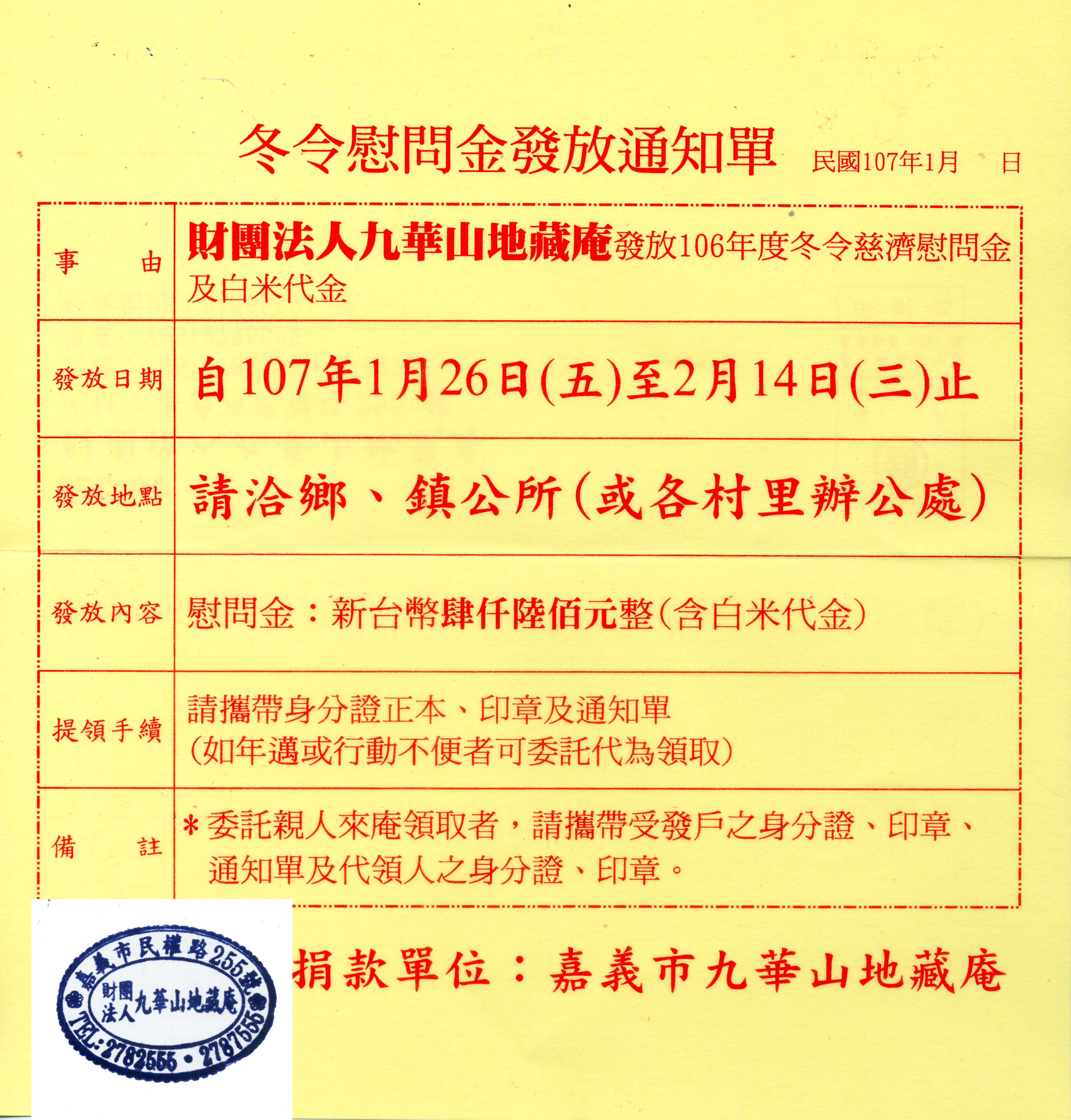 九華山地藏庵 106年度-慈濟慰問金及白米代金