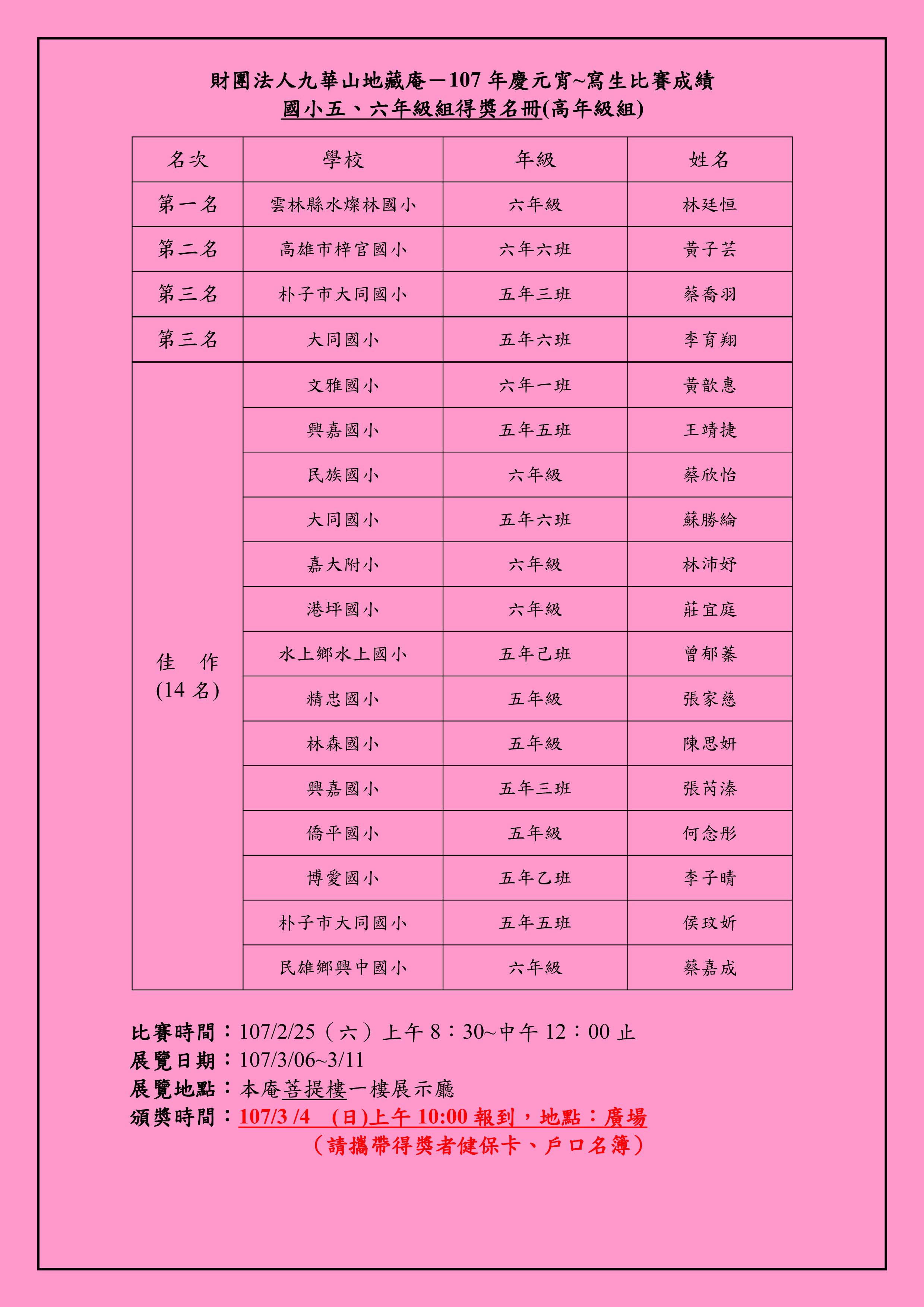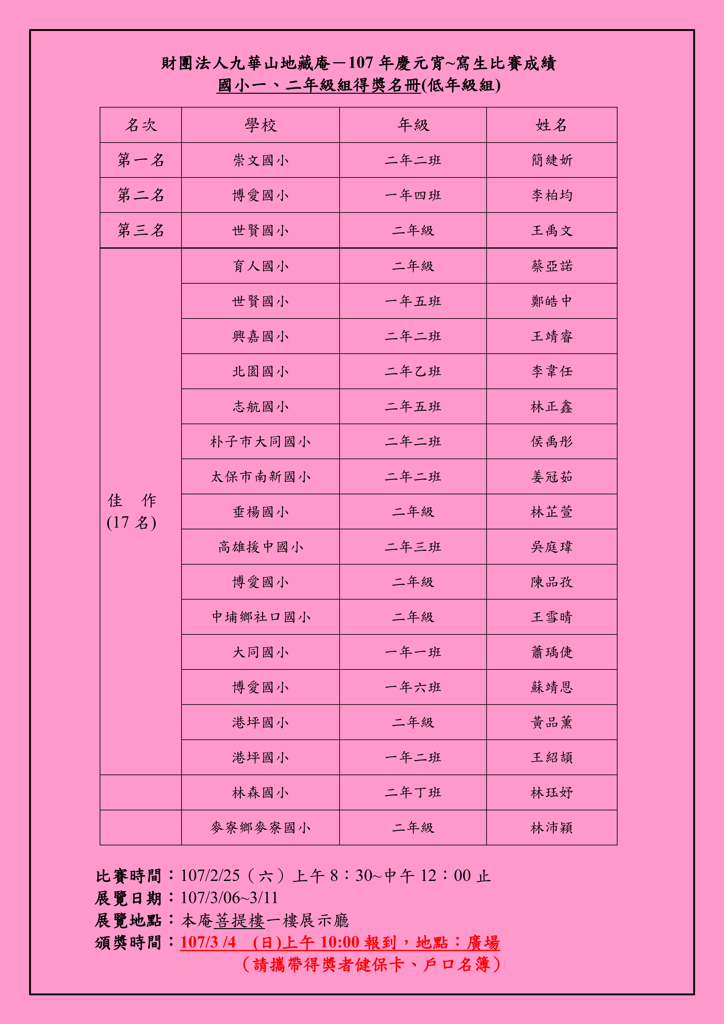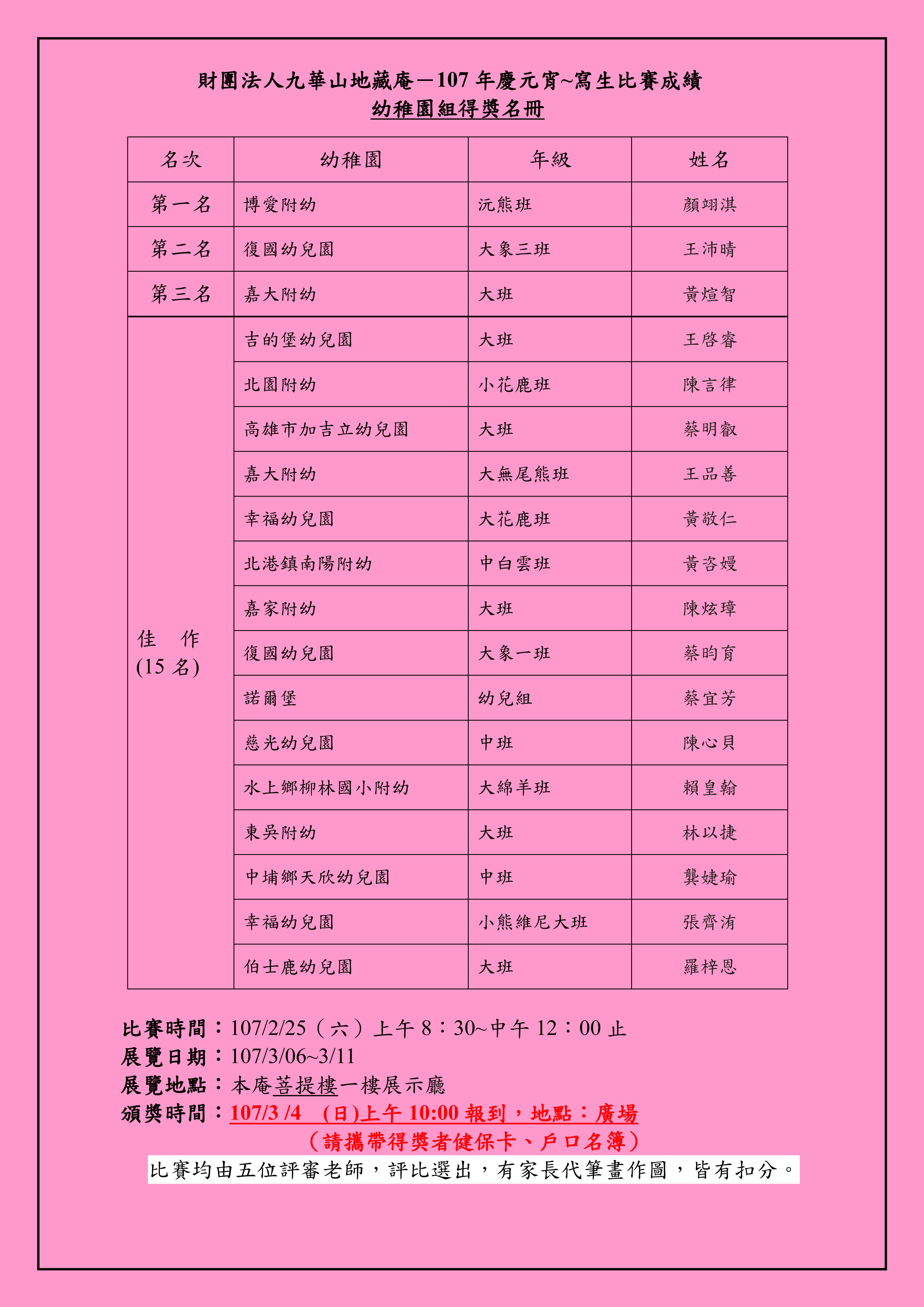 頒獎時間:107/3 /4 (日)上午10:00報到,地點︰廣場