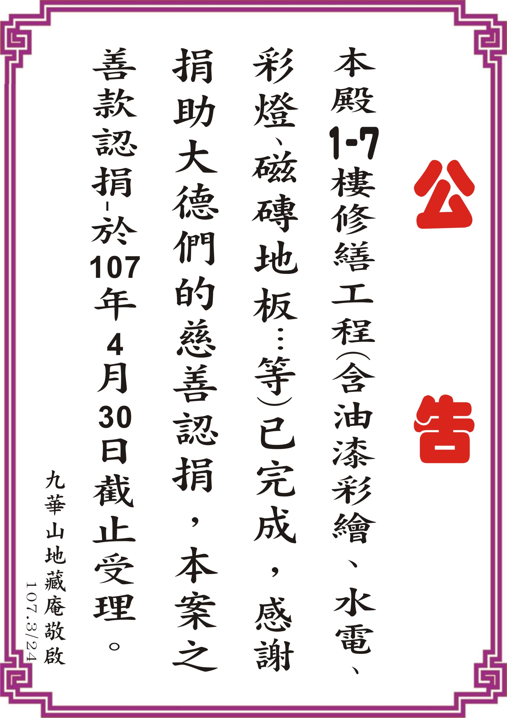 本殿1~7樓修繕工程(含油漆彩繪、水電、彩燈、磁磚地板…等)已完成,感謝捐助之大德們的慈善認捐,本案之善款認捐-於107年4月30日截止受理。