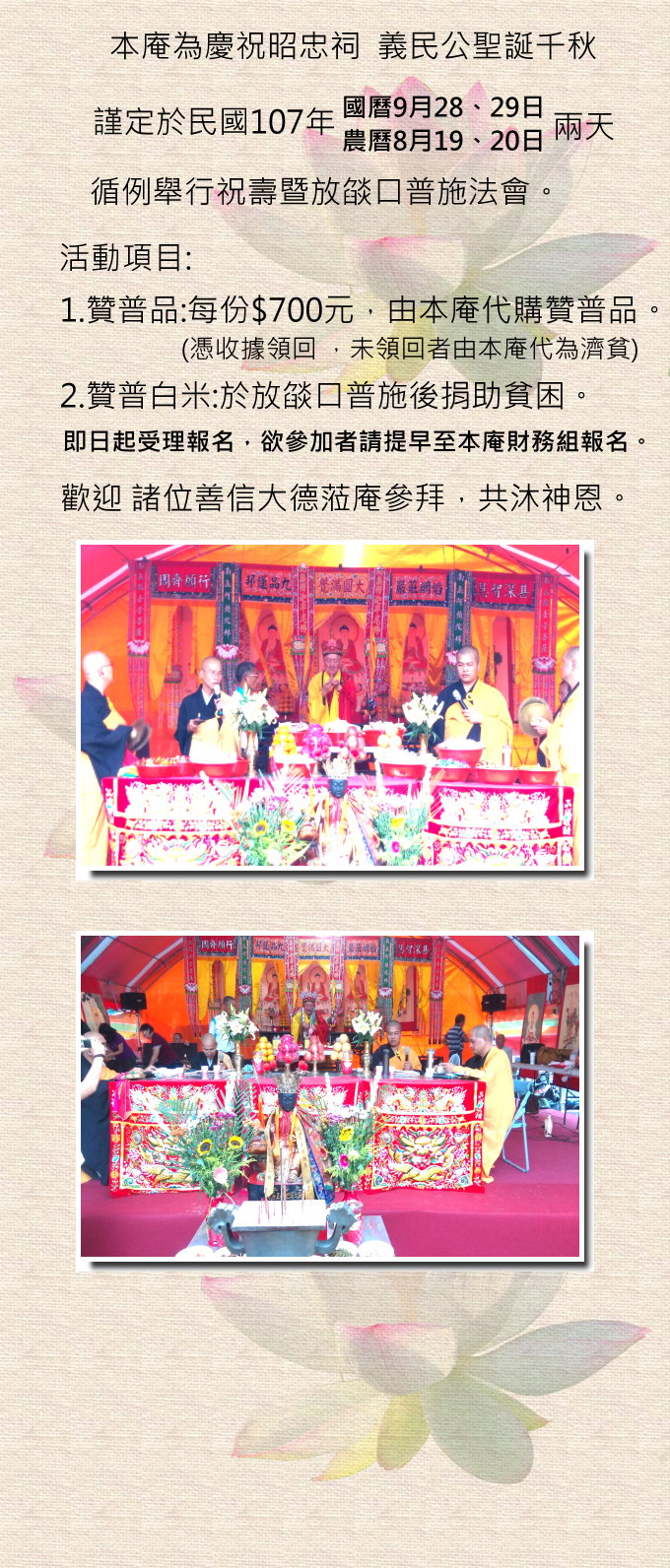 本庵為慶祝 昭忠祠 義民公聖誕千秋謹定於農曆8月19、20日兩天,舉行祝壽暨放燄口普施法會。