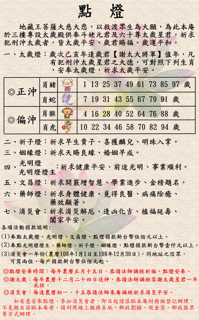民國108年【歲次己亥年肖豬】奉點太歲、祈子、姻緣、光明燈(主)、藥師、文昌燈及消災會持續受理中