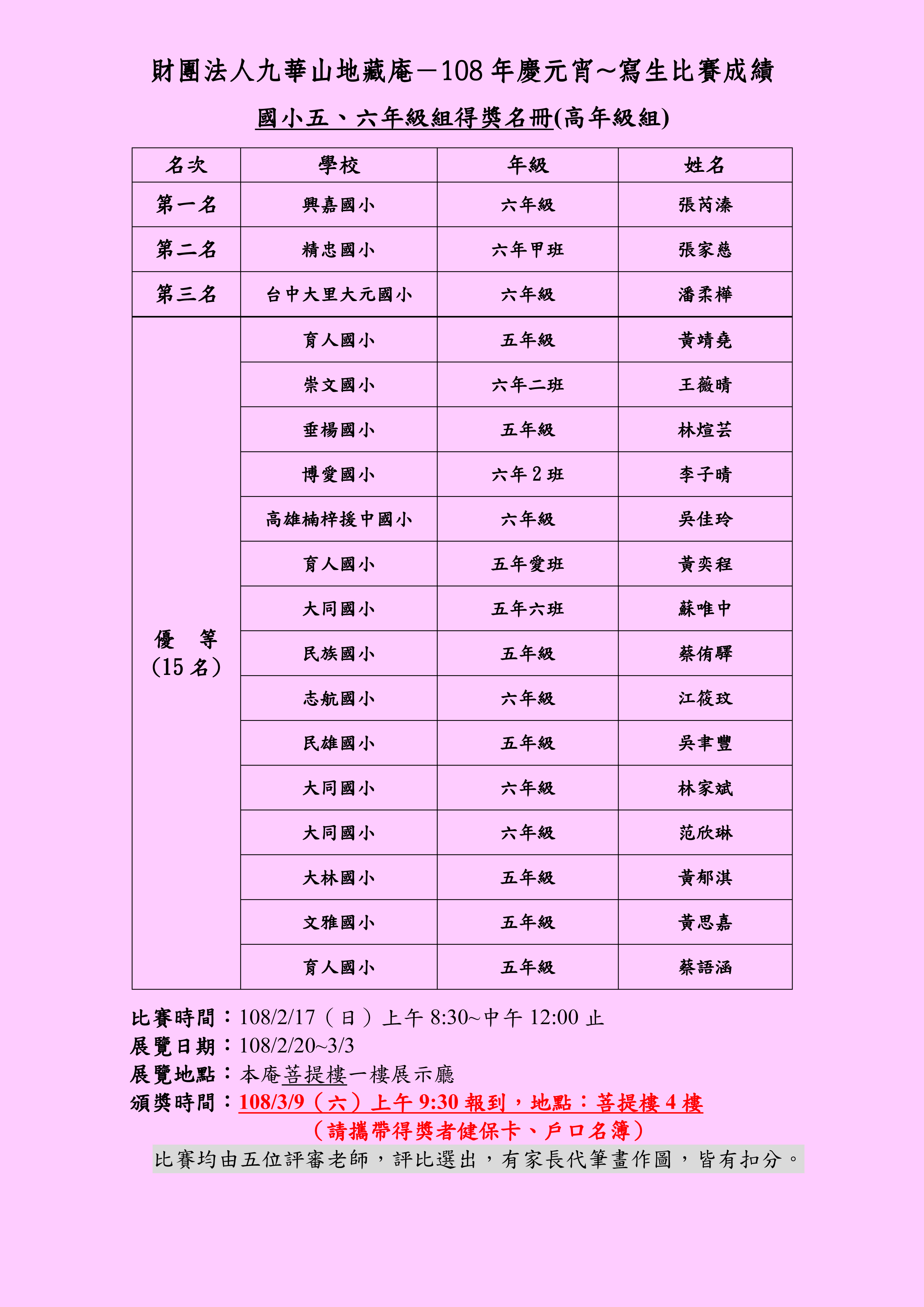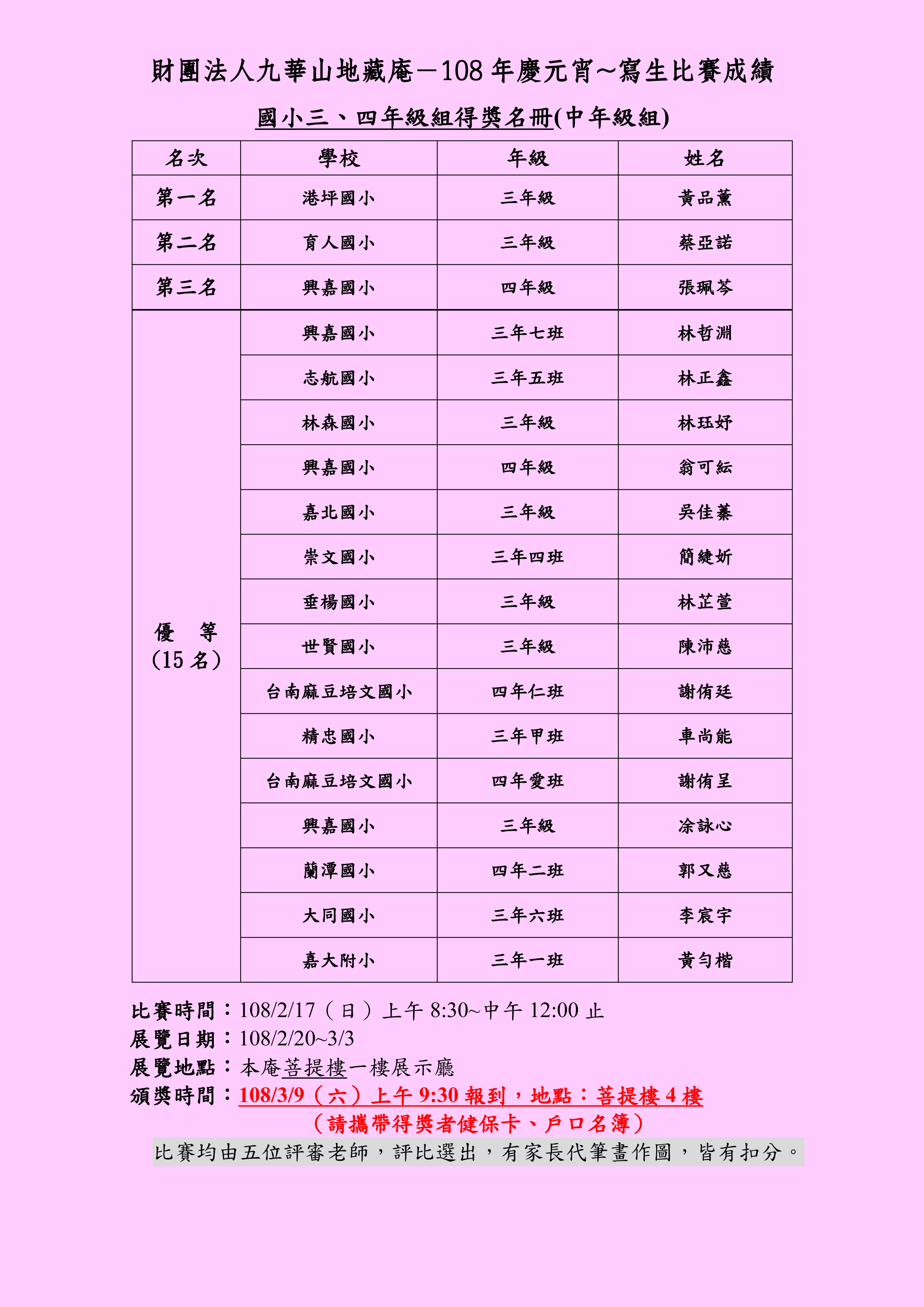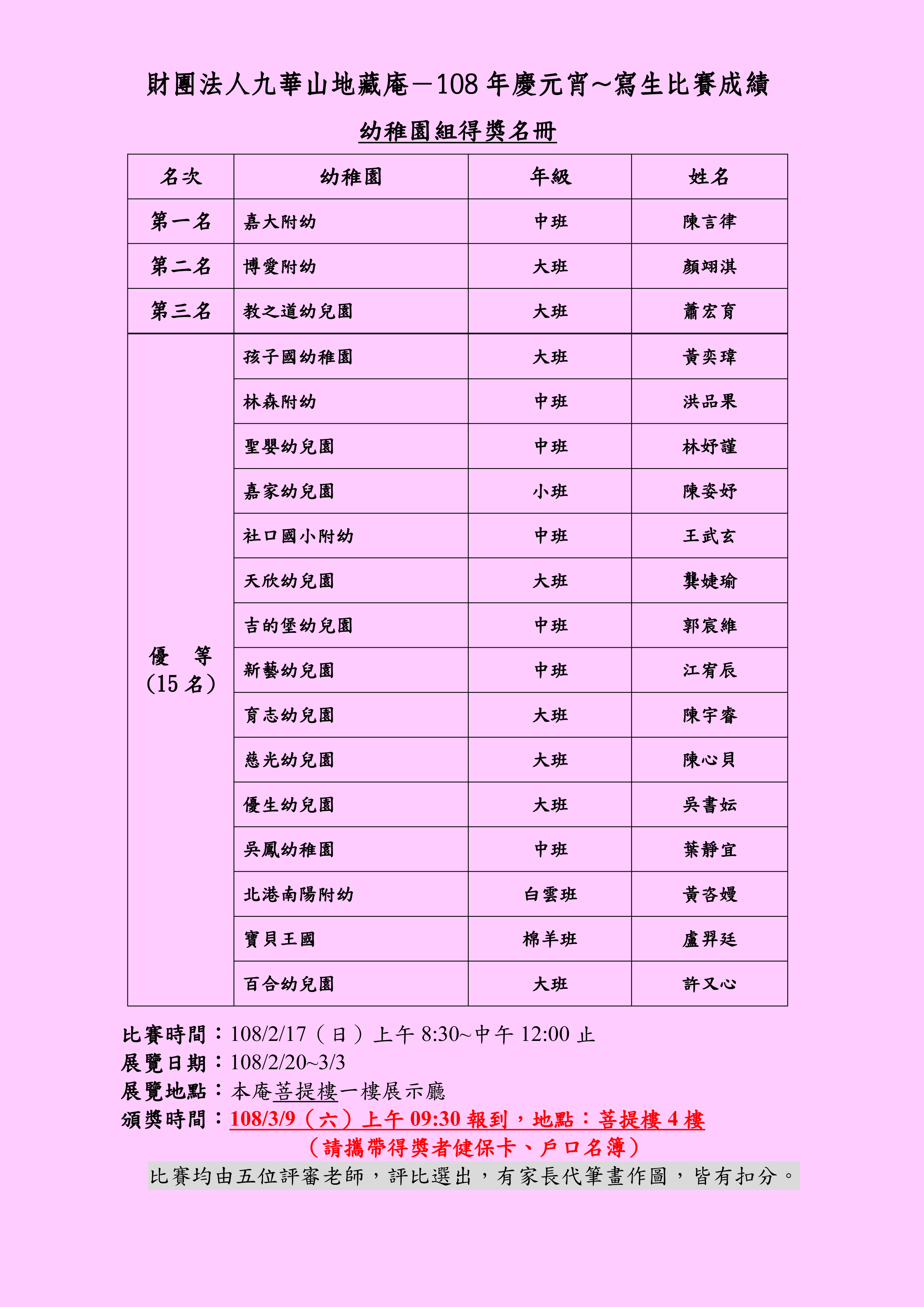 頒獎時間:108/3/9 (日)上午09:30報到,