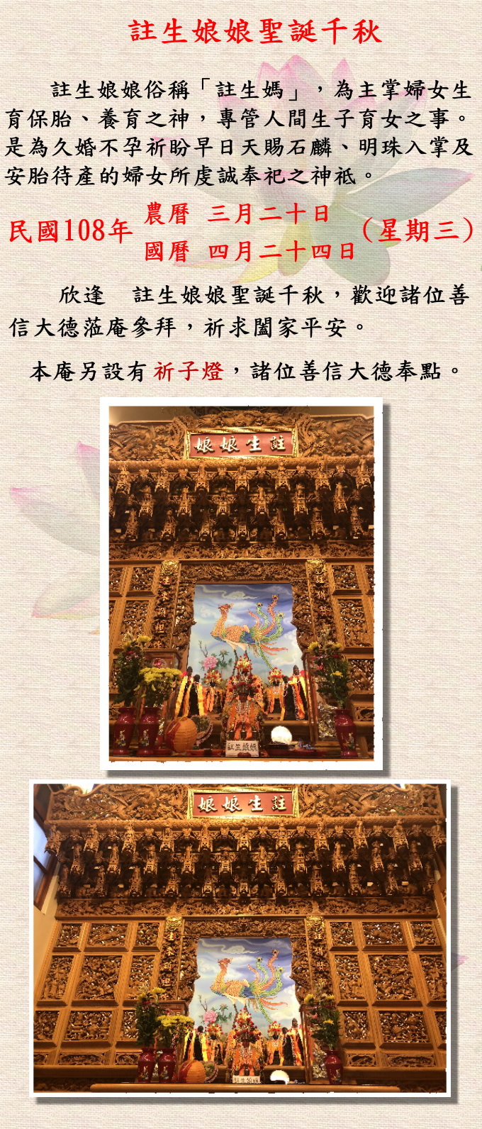 欣逢 農曆三月二十日(星期三) 註生娘娘聖誕,歡迎諸位善信大德蒞庵參拜,祈求閤家平安。