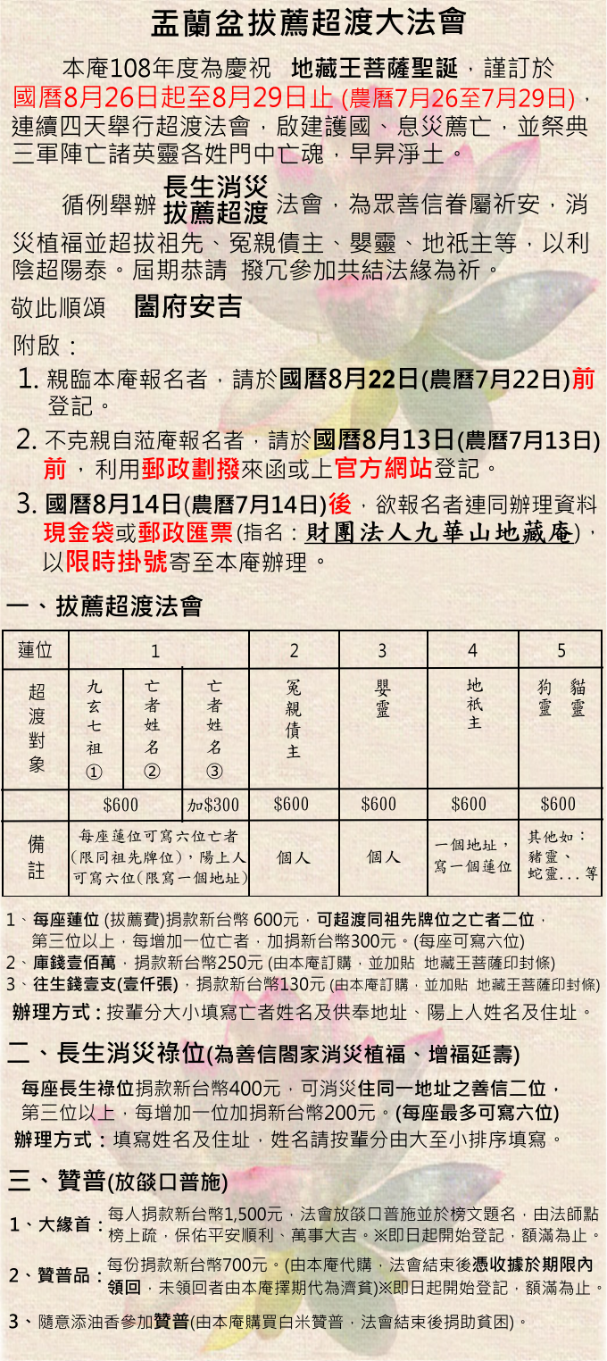 本庵108年度【盂蘭盆拔薦超渡、長生消災法會】於農曆7月26~29日連續四天舉行,已圓滿結束
