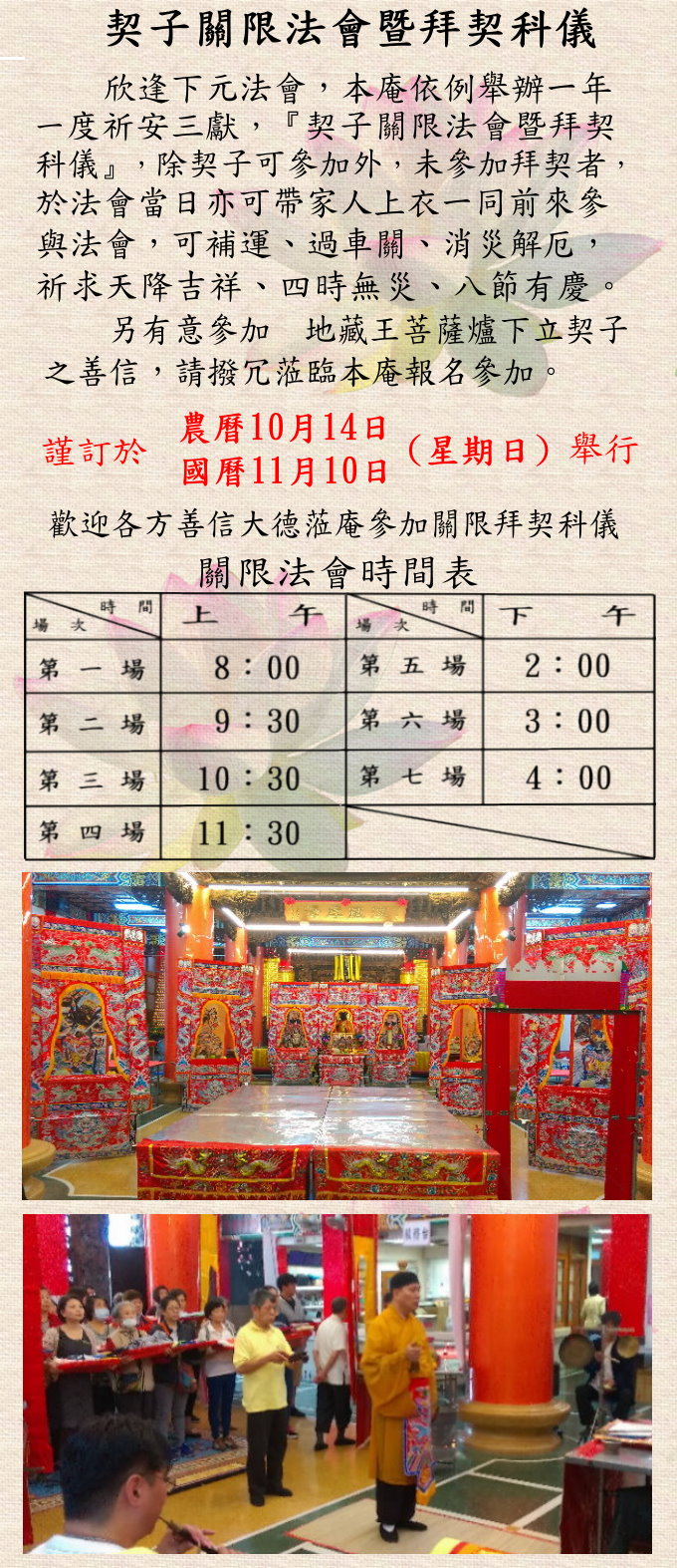 欣逢 下元法會,本庵將於農曆10/14(國曆11/10)舉辦【契子關限法會】祈求消災、補運、過車關。
