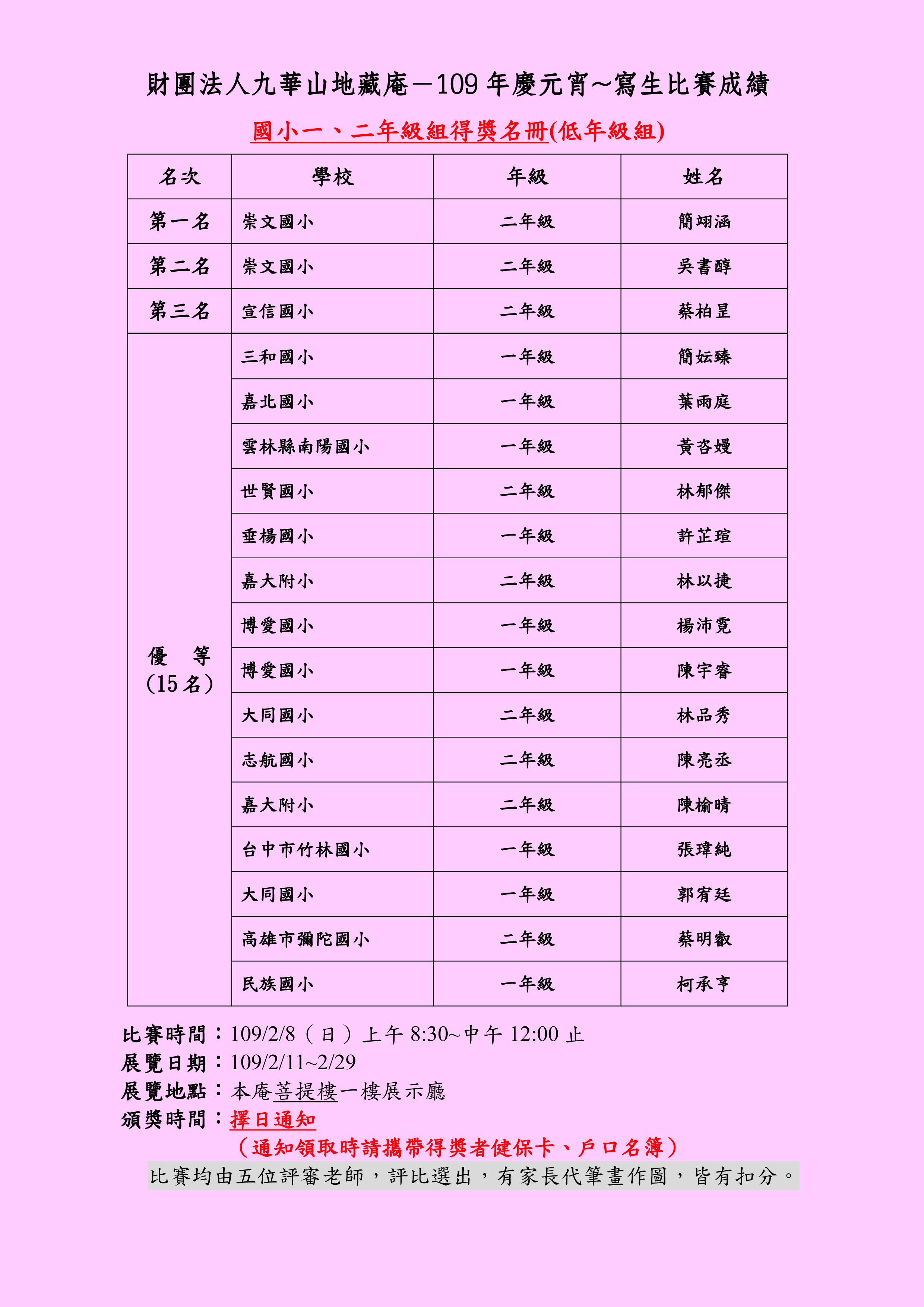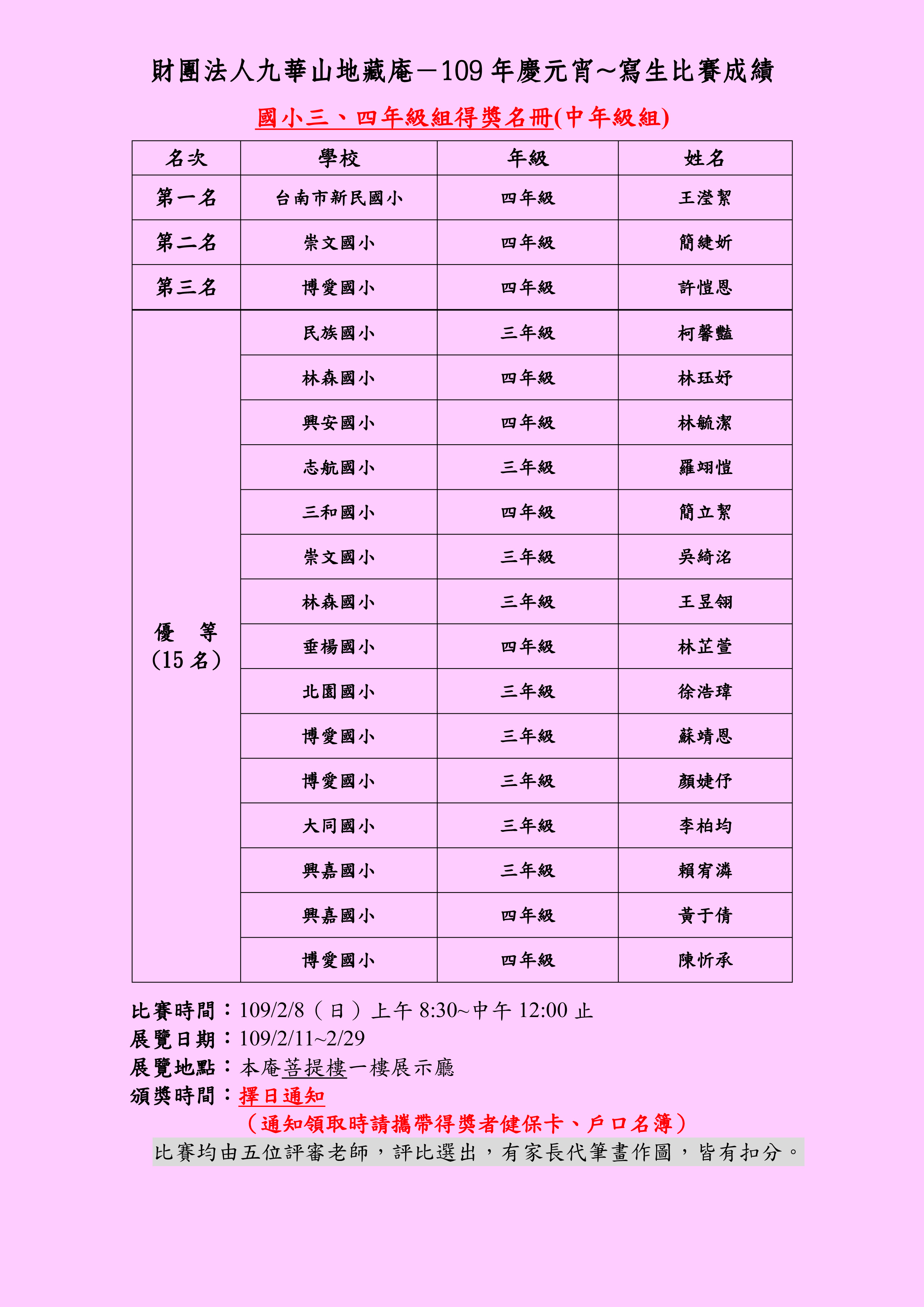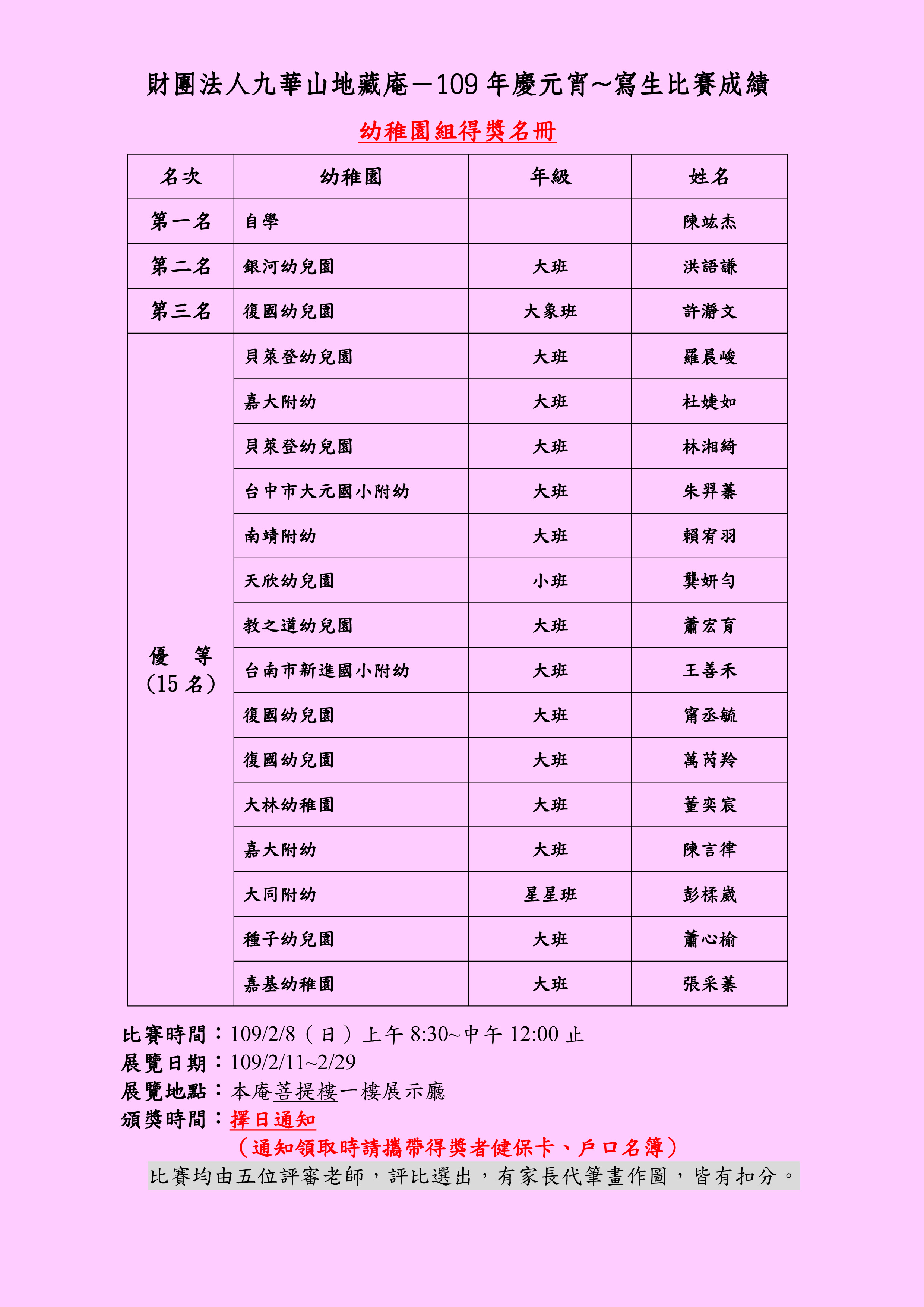 比賽均由五位評審老師,評比選出,有家長代筆畫作圖,皆有扣分。
