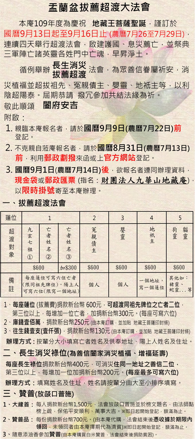本庵109年度【盂蘭盆拔薦超渡、長生消災法會】已圓滿結束~