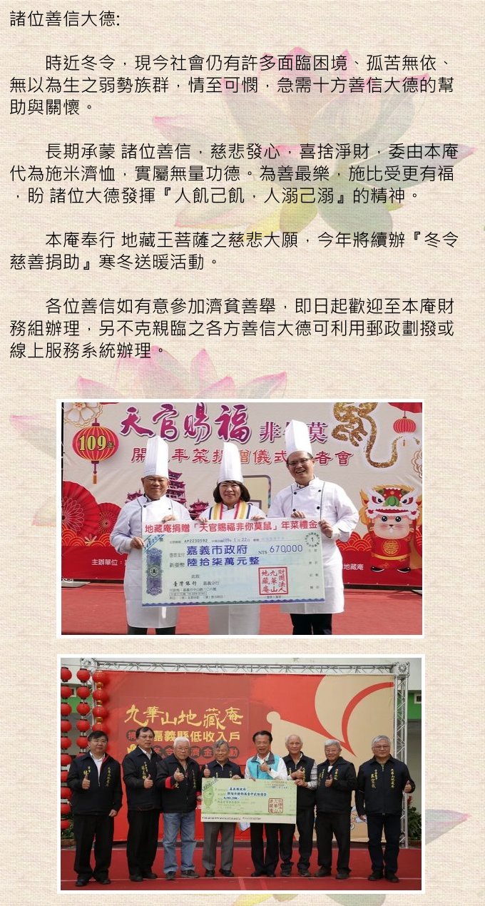 本庵今年續辦【冬令救濟慈善捐款】活動,急須各方善信慈悲發心,喜捨佈施,共襄盛舉。