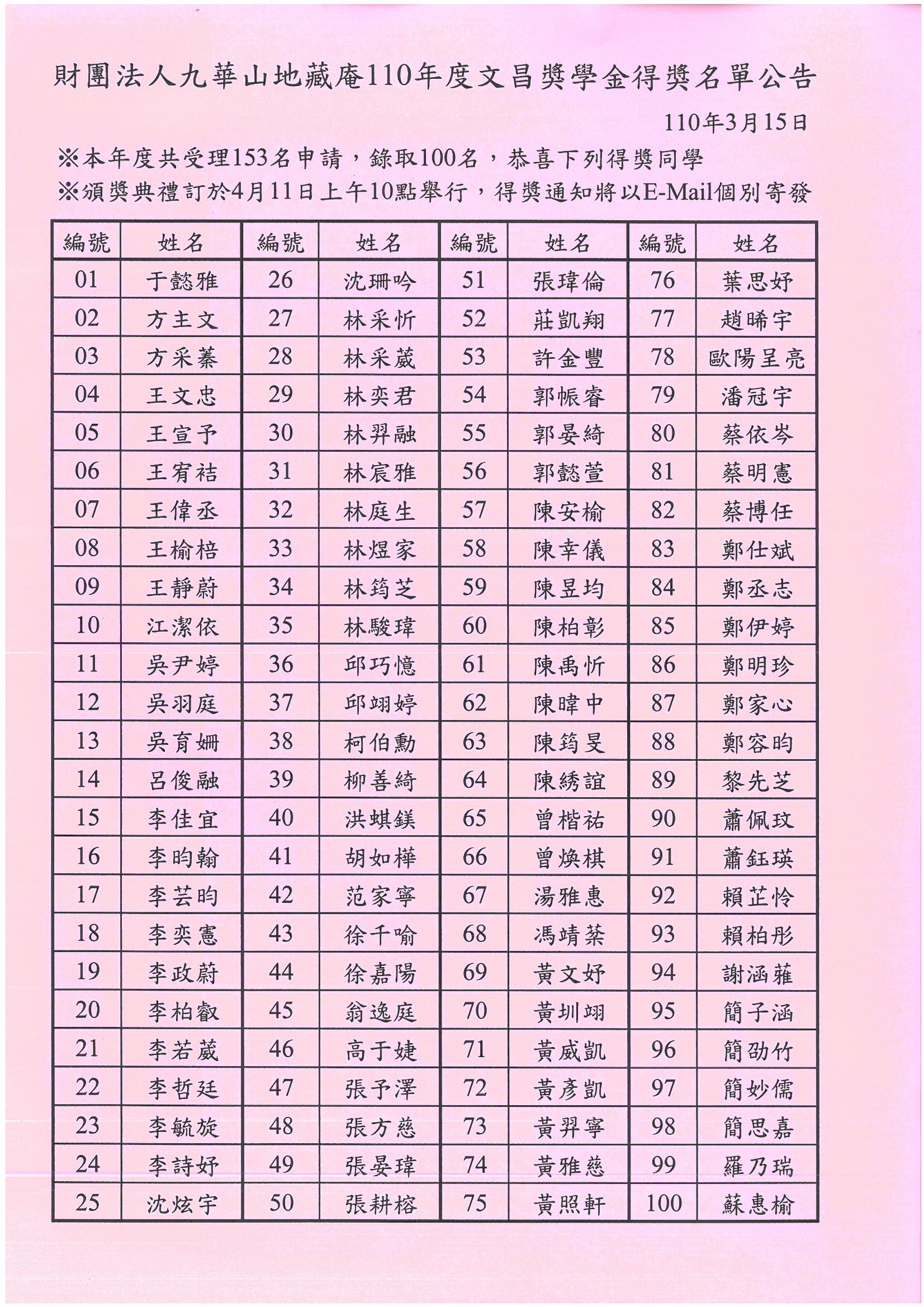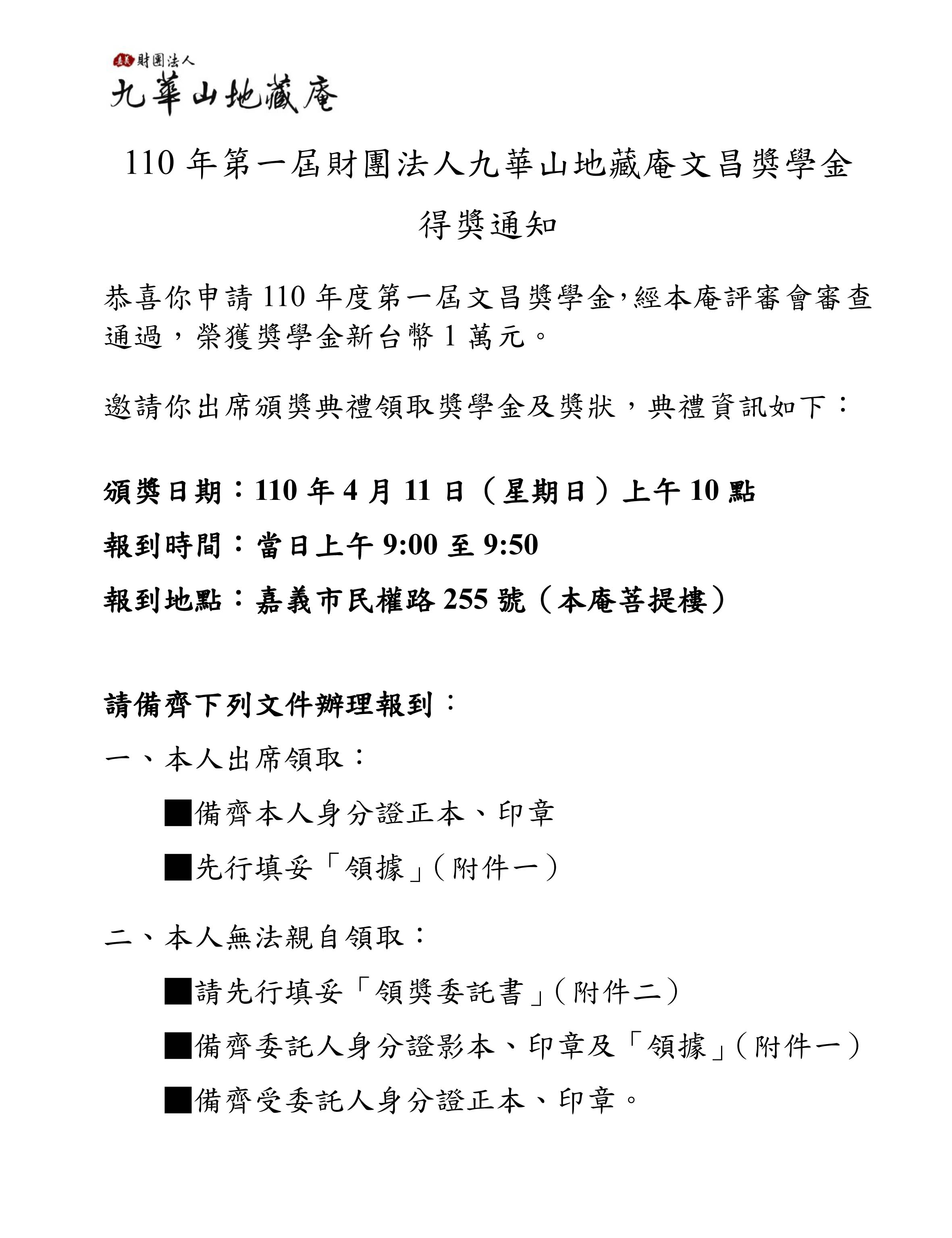 110年度文昌獎學金得獎名單公告