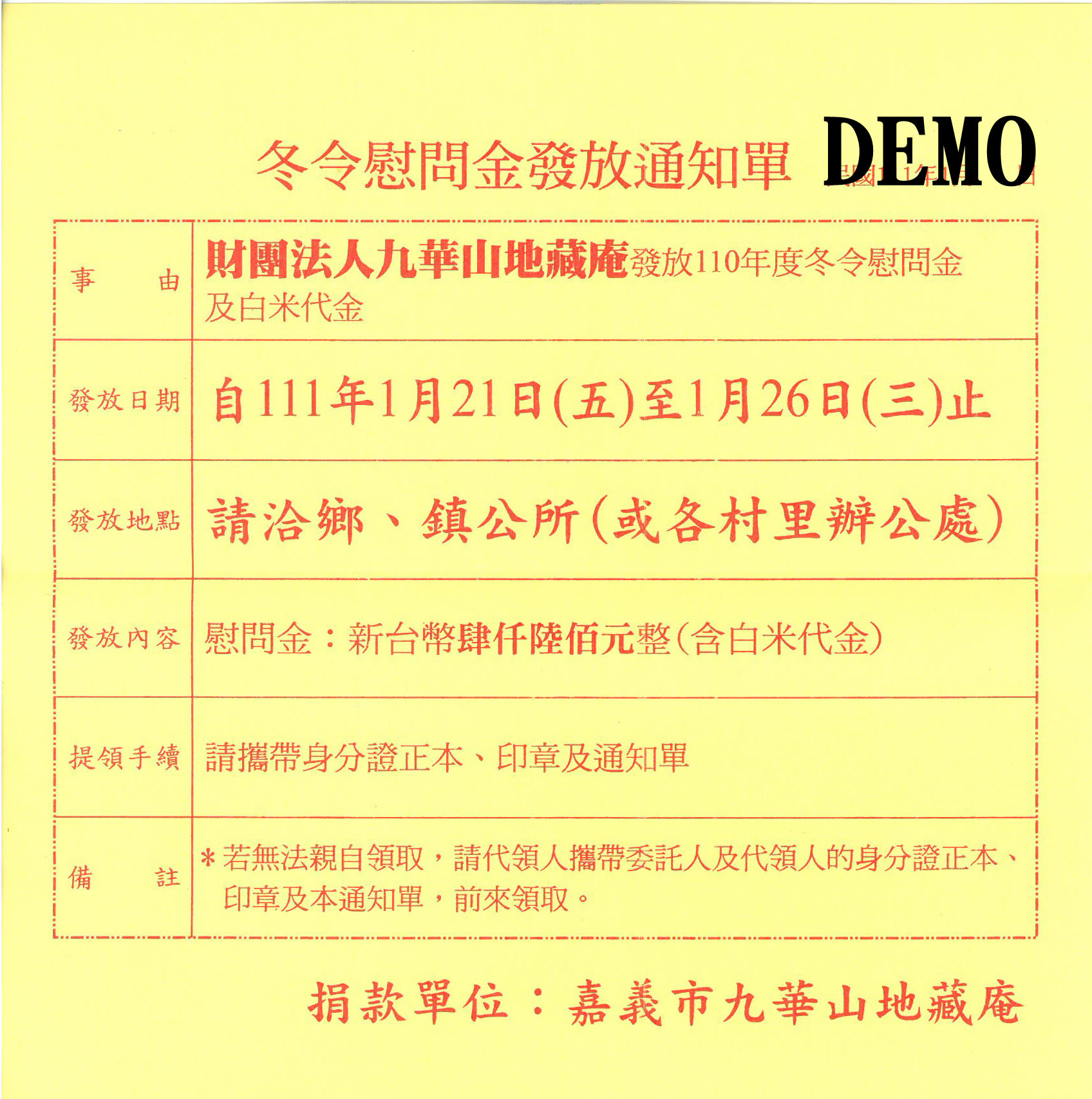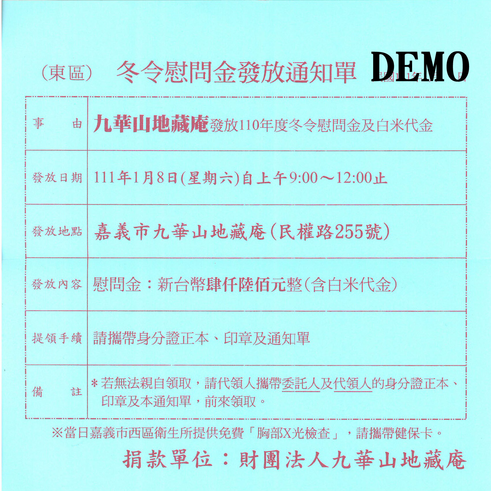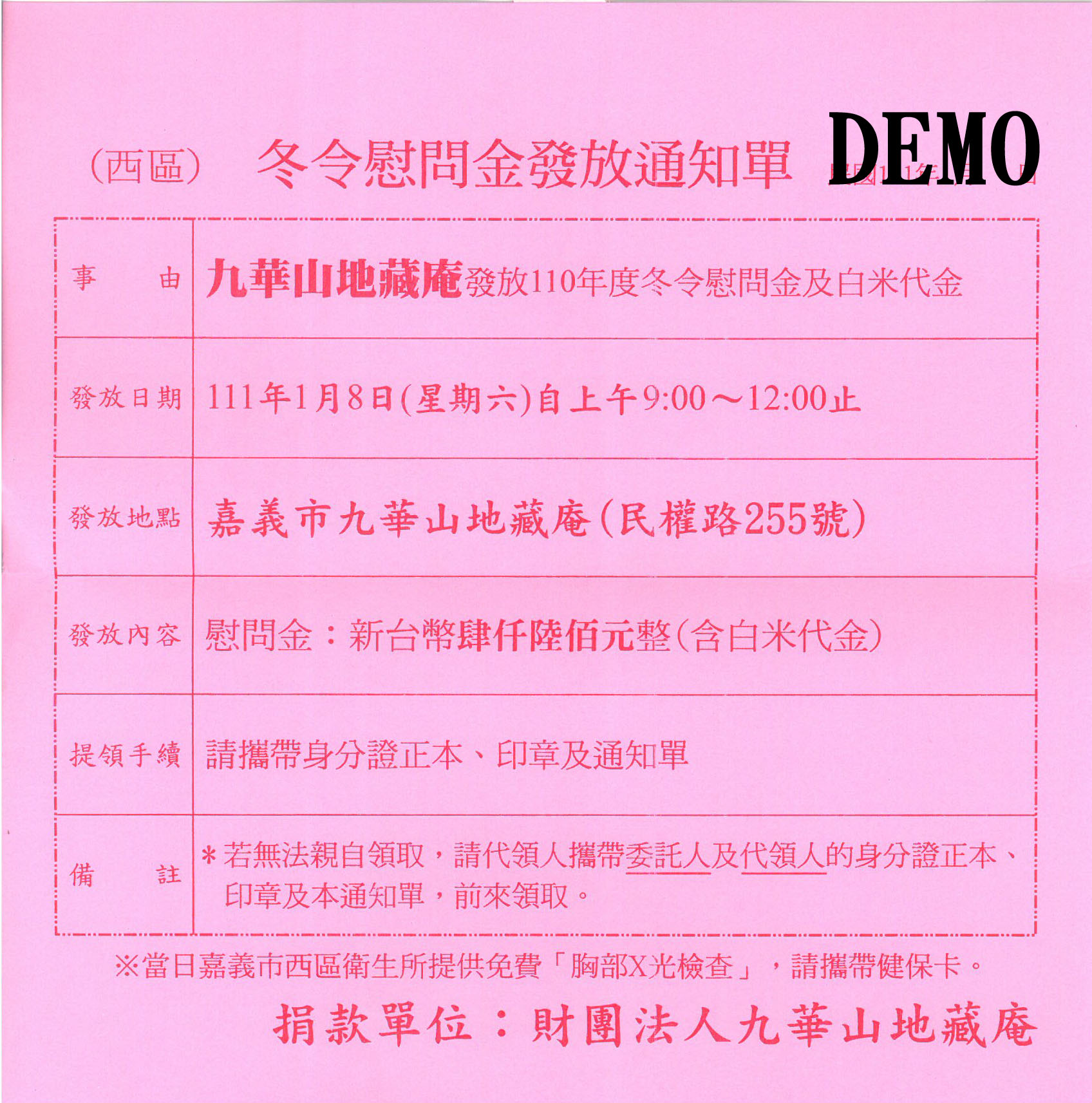 九華山地藏庵 110年度 冬令慰問金-慈濟慰問金及白米代金