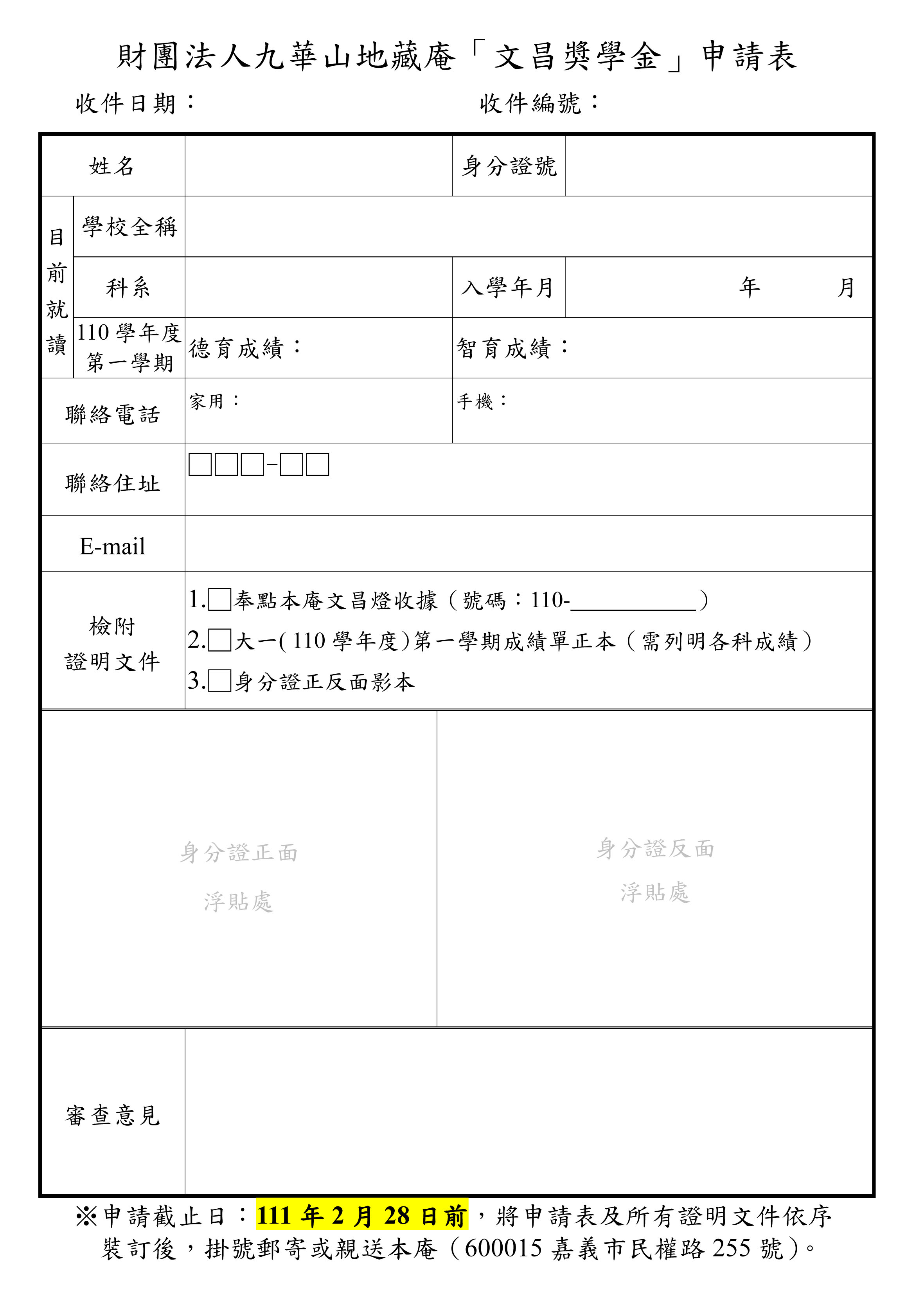 一、 自民國111年起受理申請,申請截止日:111年2月28日前,掛號郵寄或親至本庵送件申請(郵寄以郵戳為憑,逾期恕不受理)。