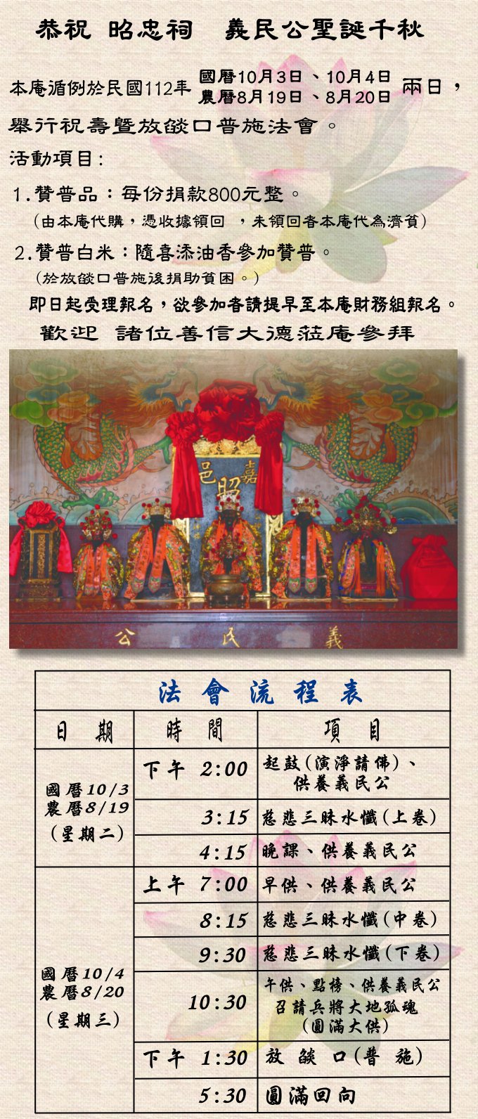 慶祝 昭忠祠 義民公聖誕千秋,本庵謹定於農曆8月19、20日兩天,舉行祝壽暨放燄口普施法會。