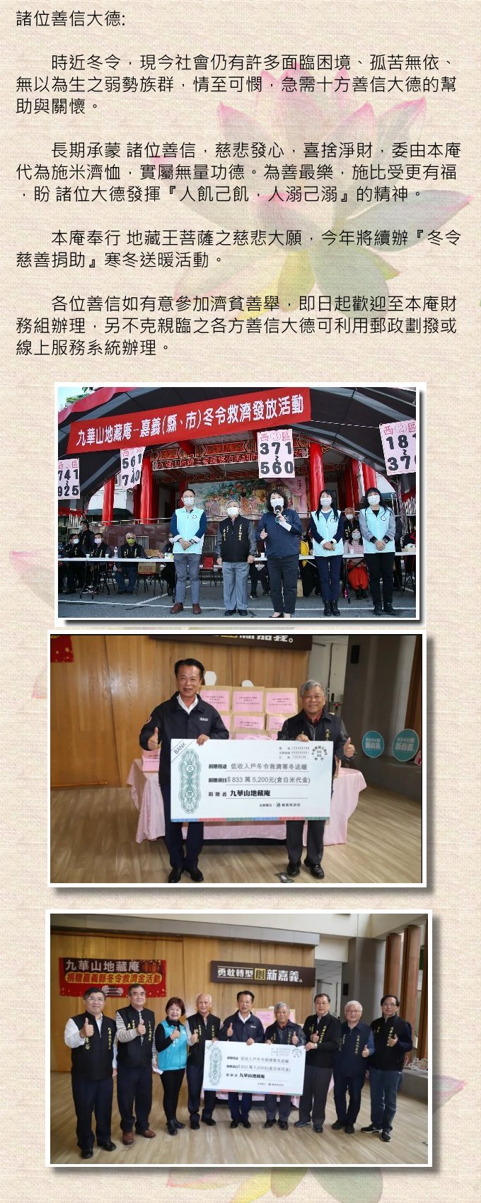 本庵今年續辦【冬令救濟慈善捐款】活動,急須各方善信慈悲發心,喜捨佈施,共襄盛舉。