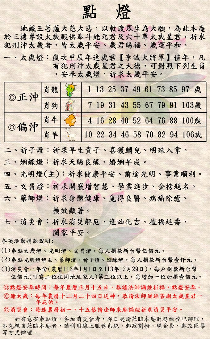 民國113年【歲次甲辰年肖龍】奉點太歲、祈子、姻緣、光明燈(主)、藥師、文昌燈及消災會開放受理