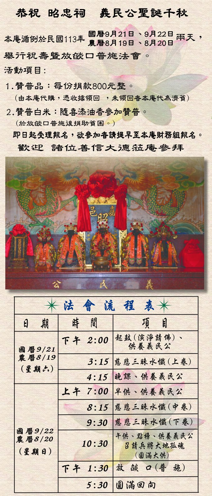 慶祝 昭忠祠 義民公聖誕千秋,本庵謹定於農曆8月19、20日兩天,舉行祝壽暨放燄口普施法會。