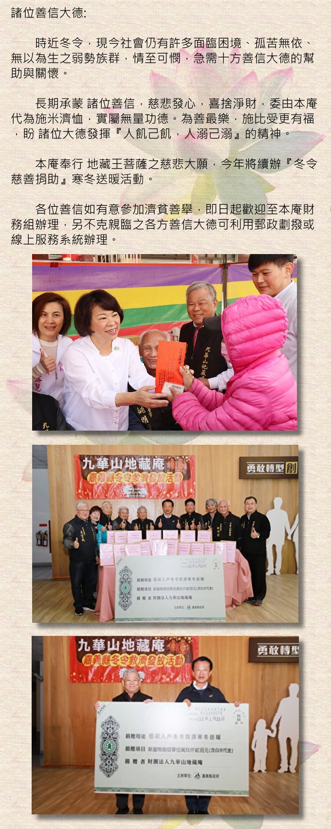 本庵今年續辦【冬令救濟慈善捐款】活動,急須各方善信慈悲發心,喜捨佈施,共襄盛舉。