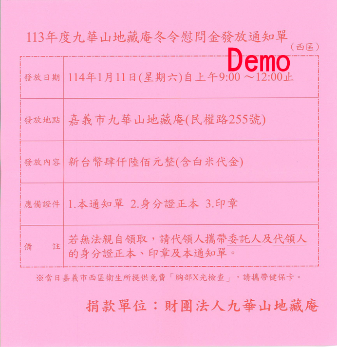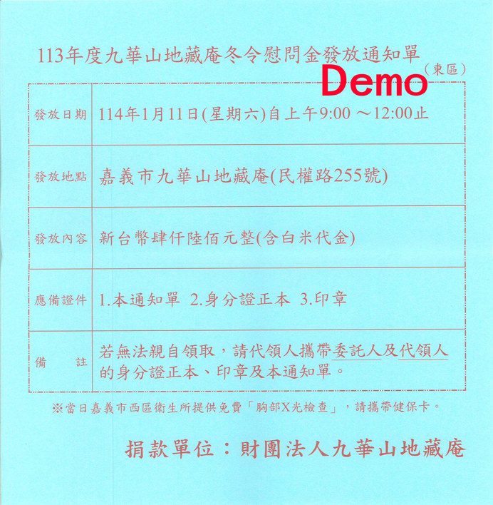 九華山地藏庵 113年度 冬令慰問金-慈濟慰問金及白米代金