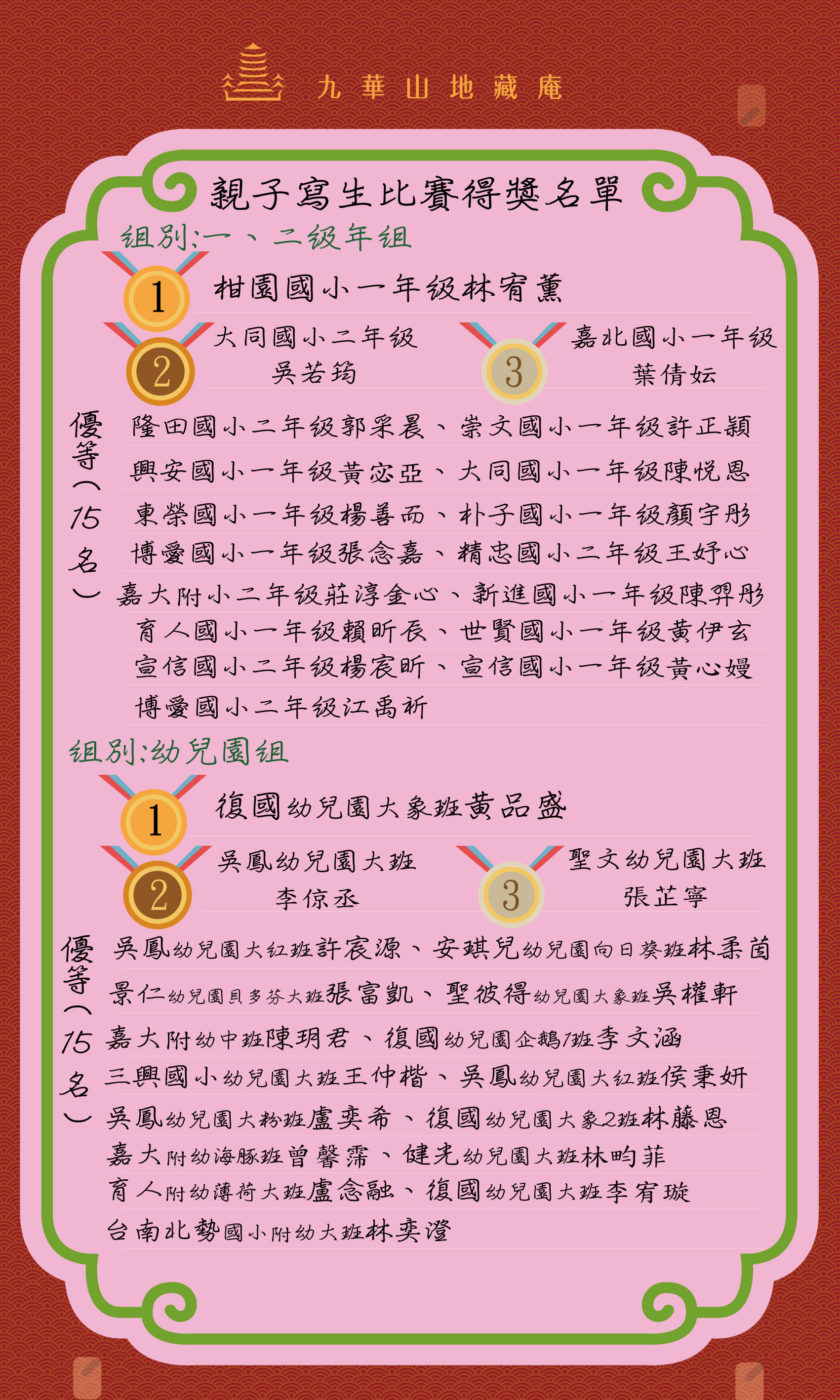 比賽均由五位評審老師,評比選出,有家長代筆畫作圖,皆有扣分。