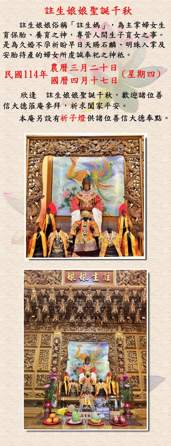 欣逢 農曆三月二十日(星期四) 註生娘娘聖誕,歡迎諸位善信大德蒞庵參拜,祈求閤家平安。