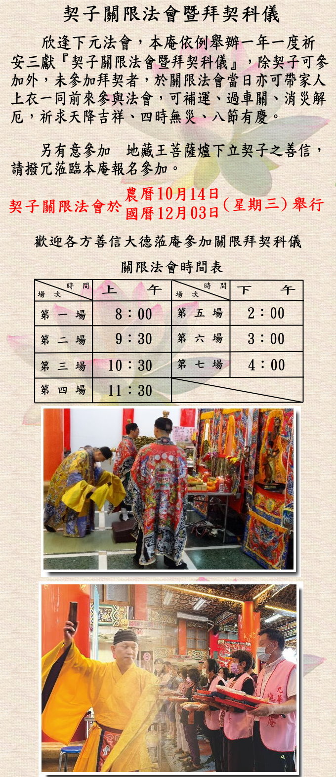 欣逢 下元法會,本庵將於國曆12/03(農曆10/14)舉辦【契子關限法會】祈求消災、補運、過車關。