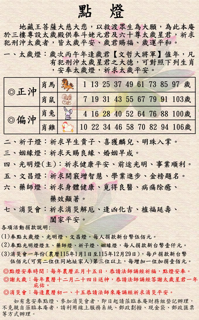 民國115年【歲次丙午年肖馬】奉點太歲、祈子、姻緣、光明燈(主)、藥師、文昌燈及消災會開放受理