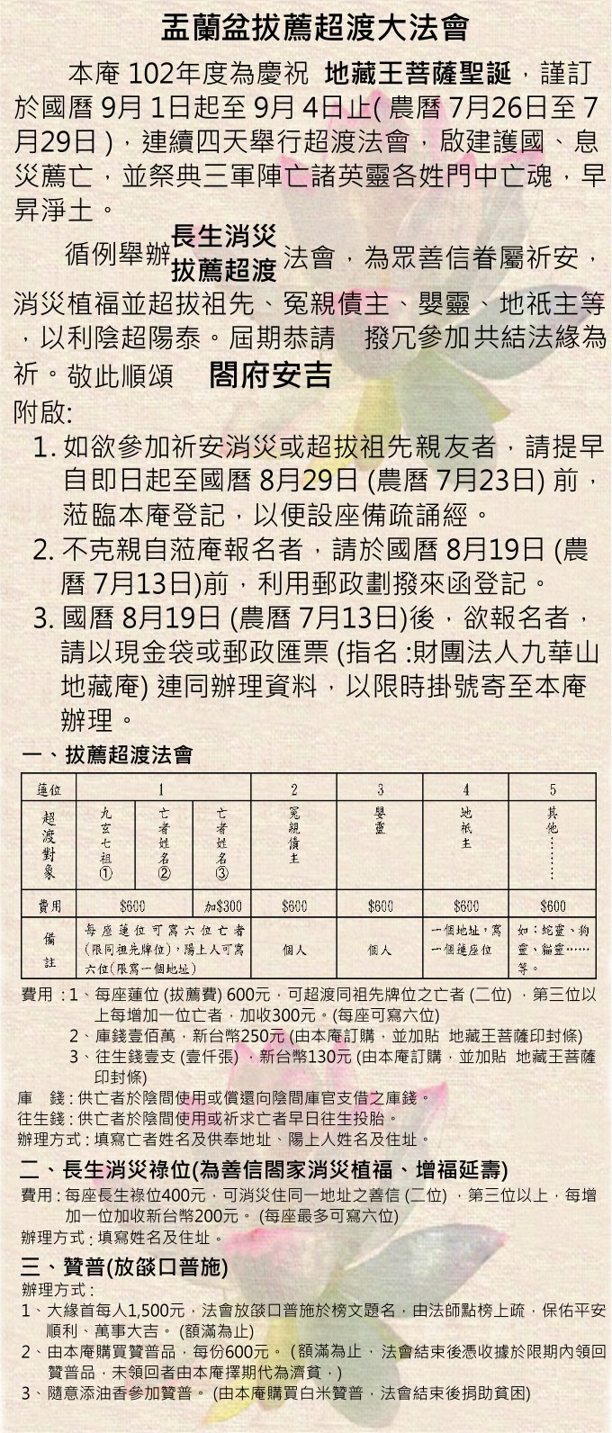 102年度【盂蘭盆拔薦超渡大法會】 已於農曆7月29日圓滿結束。