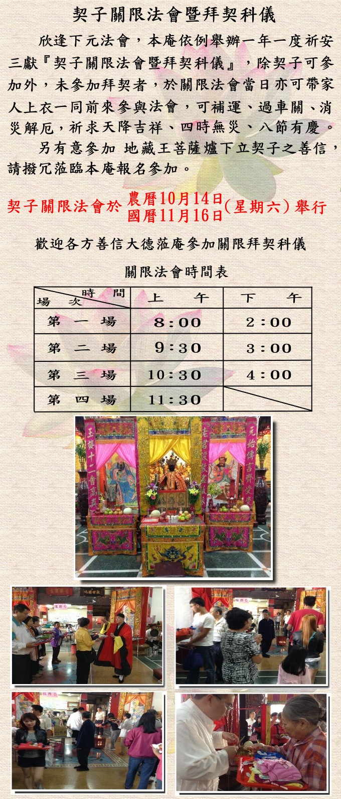 民國102年下元法會本庵於農曆10/14舉辦【契子關限法會】已圓滿結束。