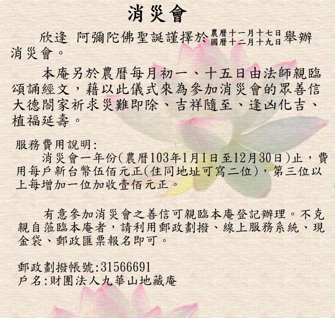 民國103年為善信閤家祈求消災解厄的消災會開始受理中。