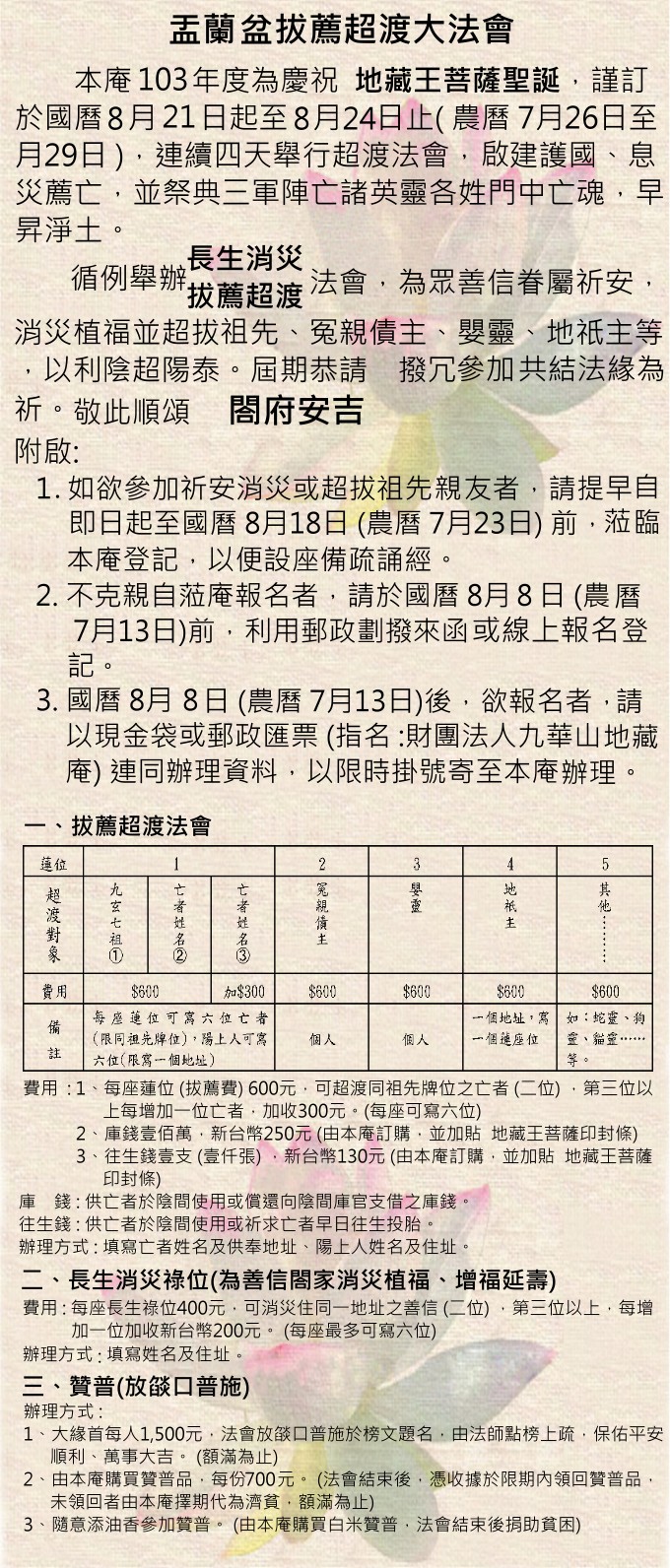 本庵103年度【盂蘭盆拔薦超渡、長生消災法會】訂於農曆7月26~29日連續四天舉行,已圓滿結束。