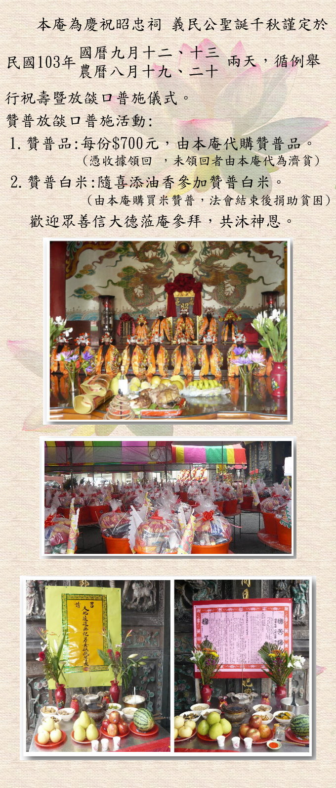 本庵為慶祝 昭忠祠 義民公聖誕千秋謹定於農曆8月19、20日兩天,舉行祝壽暨放燄口普施法會。